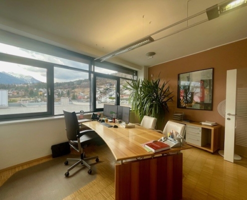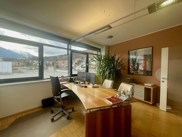 Die Bürofläche ist mit dreifach verglasten Kunststoff-Aluminiumfenstern ausgestattet, die zusätzlich über elektrische Markisen zur optimalen Beschattung verfügen. Für eine angenehme Arbeitsatmosphäre sorgt die effiziente Beheizung über eine Öl-Zentralheizung mit Heizkörpern, während die Warmwasserversorgung über einen Boiler gewährleistet wird.