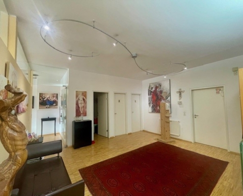 Der Empfangsbereich umfasst eine Fläche von ca. 34,25 m² und ist mit einem Schreibtisch inklusive Theke und Schubladen ausgestattet. Zusätzlich befinden sich dort ein Hängeschrank, eine Garderobe, eine schwarze Kommode sowie ein wandmontierter Beistelltisch.