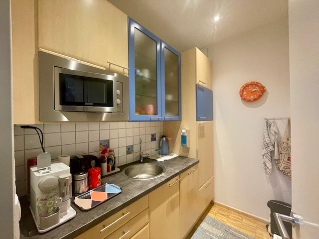 Die Küche hat eine Größe von ca. 3,48 m² und verfügt über eine Mikrowelle, Waschbecken, Geschirrspüler, Kühl- und Gefrierschrank sowie genügend Schränke und Schubladen.