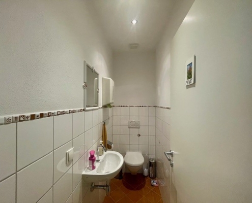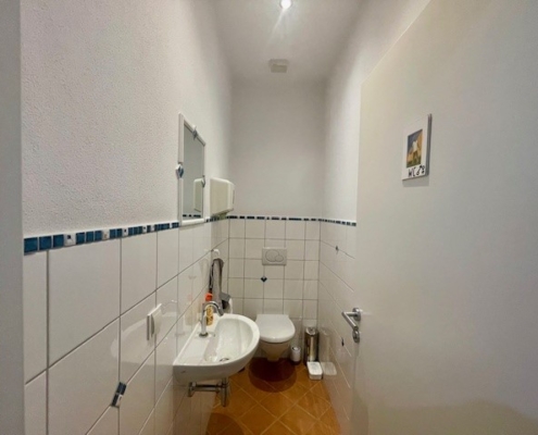 Die sanitären Anlagen bestehen aus zwei getrennten WC-Einheiten für Damen und Herren, jeweils mit einer Fläche von ca. 1,98 m².